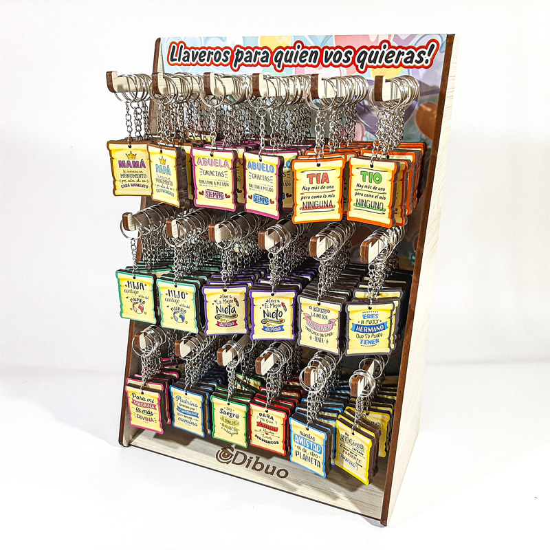 Exhibidor con Llaveros de Tablas de Surf, fabricado en madera de 5,5 mm con base para poder apoyarlo en cualquier superficie. Posee 12 ganchos para colocar cada uno de los modelos de llaveros.