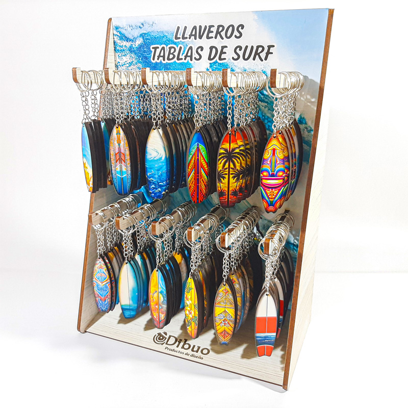 Exhibidor con portallaves de parentesco, fabricado en madera ranurada con 4 perforaciones para colocar sobre la pared. Posee 18 ganchos blistéros (con cinta bifaz en su parte posterior) para colocar cada uno de los modelos.
