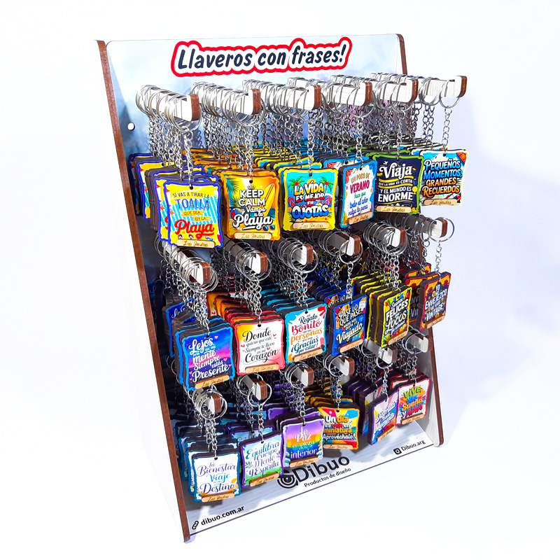 Exhibidor con Imanes con frases, fabricado en madera de 5,5 mm con base para poder apoyarlo en cualquier superficie y 4 perforaciones para colocar sobre la pared. Posee 18 cajones para colocar cada uno de los modelos de imanes.